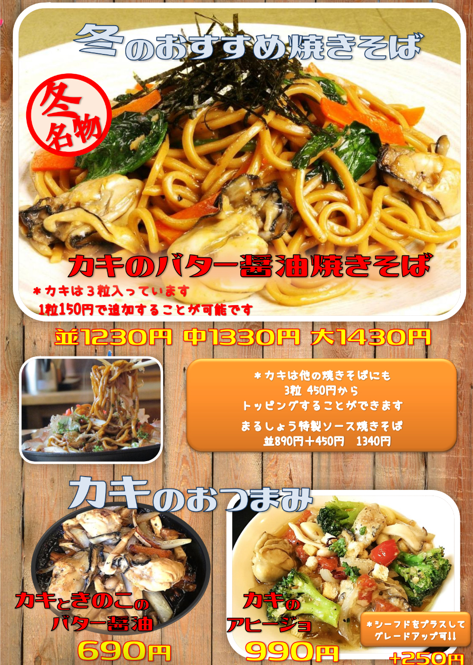 まるしょうの冬の名物「カキ」を使った焼きそばとおつまみメニューです。